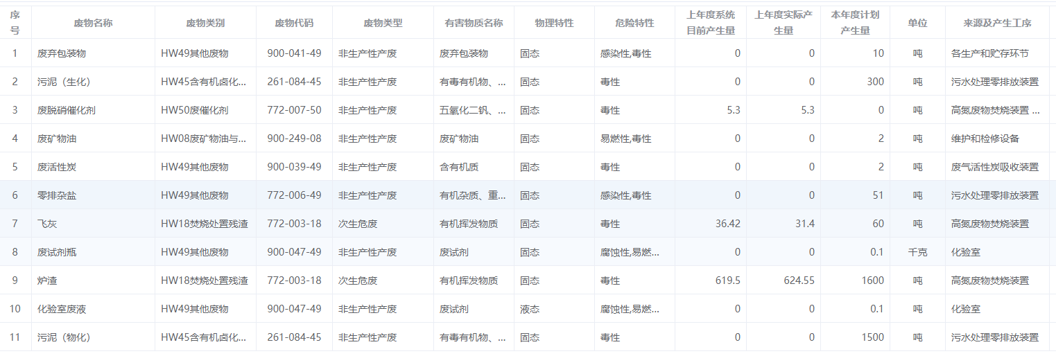 危廢種類:廢棄包裝物、污泥(物化)、廢脫銷(xiāo)催化劑、污泥(生化)、廢礦物油、廢活性炭、零排雜鹽、飛灰、廢試劑瓶、化驗(yàn)室廢液、爐渣。